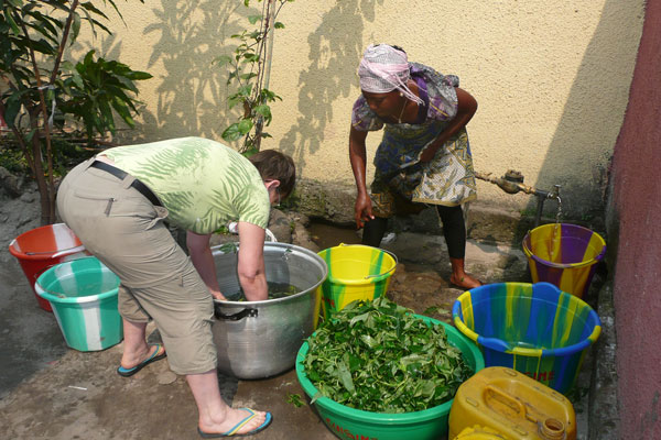 So dauert allein das Putzen und Waschen von Matembelé (das Grün der Süsskartoffel) mit 4 Personen etwa 5 Stunden.
