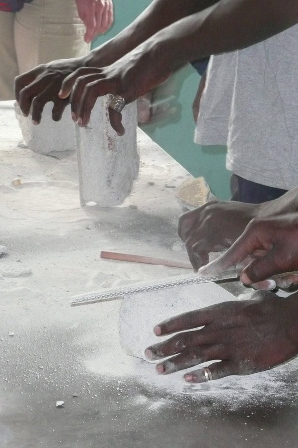 Nach der Maskenerstellung koennen die Kinder im Waisenhaus mit Gasbetonsteinen Skulpturen gestalten.